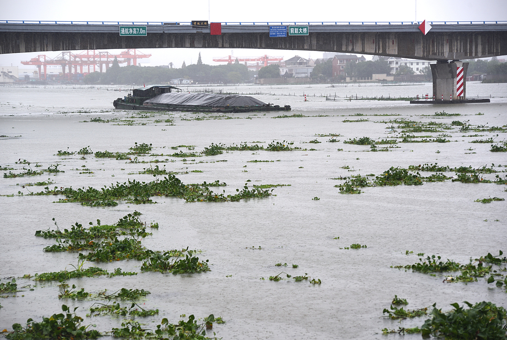 2024年中午,第21号台风“康妮”袭击浙江绍兴。由于河水的飙升,杭永大运河溢出了大量的水葫芦,漂浮在河面上。视觉中国 图