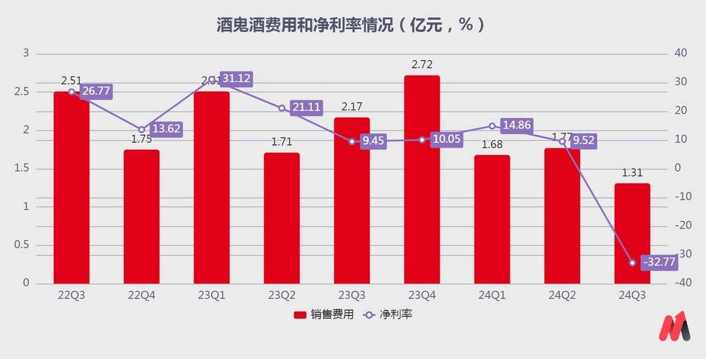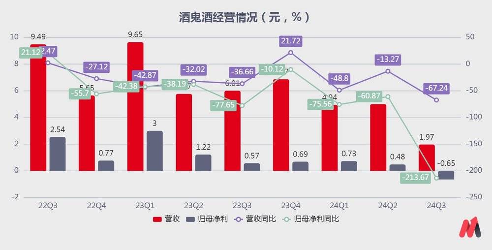 但是从2022年底开始,酒鬼酒收入净利润双双颤振,2024年上半年净利润同比下降71.32%。酒鬼酒还开始了许多措施,如调整商品、移动渠道、更换教练等。看到Q2的营业收入大幅下降,但包括关键白酒销售旺季在内的Q3无法直接阻止下降趋势:营业收入同比下降67.24%,仅达到1.97亿;归属于母亲的净利润直接处于亏损状态,同比下降213.67%。