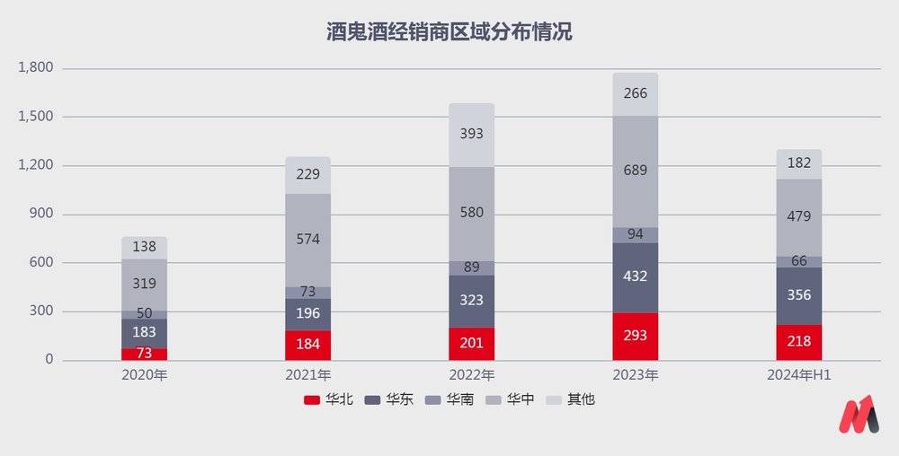 今年酒鬼酒经销商大幅下滑,上半年底已降至1301家;其中,华北、华东、华南、华中等地区经销商数量较2023年底分别减少75家、76家、28家、210家、84家;平均经销商数量较去年同期下降12.22%至76.08万元/家。