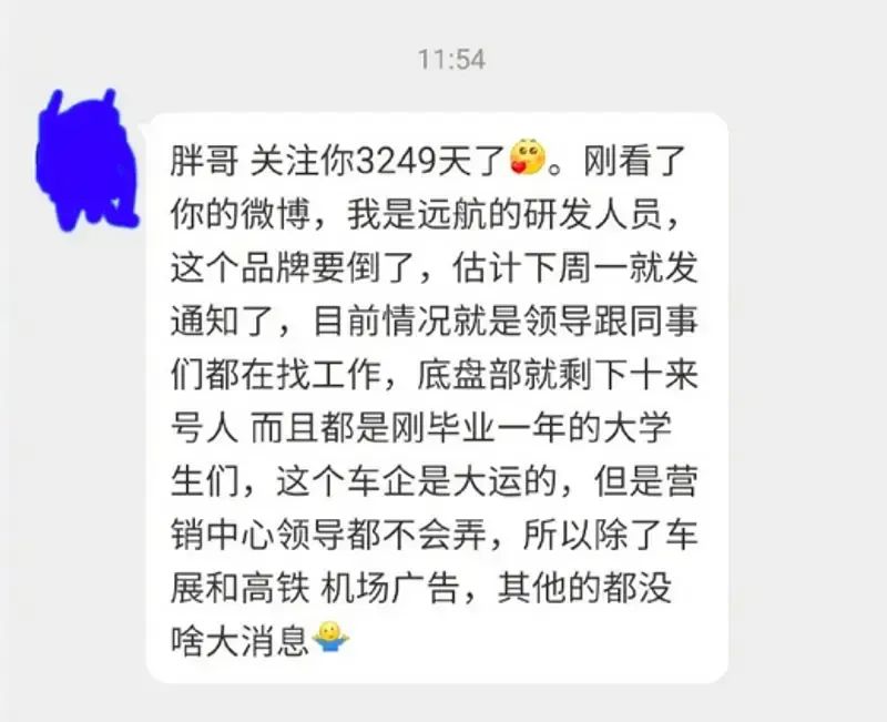 原因是一名自称是远航汽车R&D部门的工作人员表示,目前底盘R&D部门只剩下十几名员工。此外,还有部门员工 强制性休假一周,而且没有通知复岗时间,待岗期间公司没有提供工资和补偿。