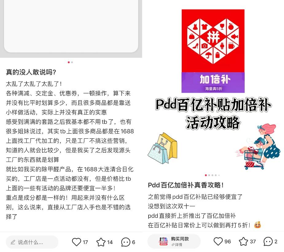 在小红书、微博、豆瓣等社交平台上,很多曾经带领网友研究过双11规则,给出最低价策略的KOL,都转型为全网寻宝、寻找“平替”的KOL。他们会搜索各种商品的最低价格渠道或同源“平替”,教粉丝如何在不等待天猫JD.COM推广的情况下探索宝藏。