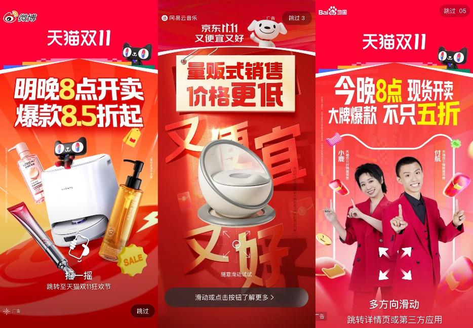然而,双11的周期仍在延长,宣传和营销的范围也在同步增加。除了街头广告牌和电视上的插播广告,无法避免的APP跳转广告吸引了客户的抱怨。无论消费与否,这场狂欢都必须有观众。