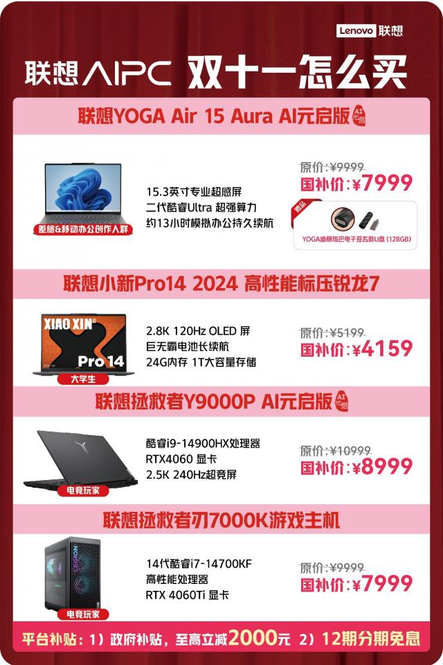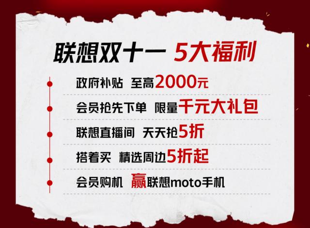 好的产品配好福利才算双十一狂欢。这一次,双十一联想带来了五大优惠,完美的产品质量和真诚的促销优惠,回馈了双十一客户,掀起了新年双十一购物狂欢的热潮。第一,国家补贴无上 2000 元,用买普通电脑的钱就能买到一台新的。 AIPC!只要你是联想会员,不仅可以先下单自己喜欢的产品,还有机会获得限量1000元的礼包和联想。 moto 手机。
