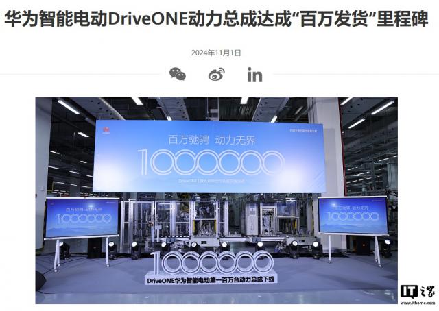 IT 世家 11 月 1 据华为数字能源官网消息,每日消息,10 月 26 日本,“百万驰骋动力无界”华为智能电动 DriveONE 东莞南方工厂举行百万动力总成下线仪式,华为智能电动 DriveONE 迎来第一个动力总成“百万发货”里程碑。