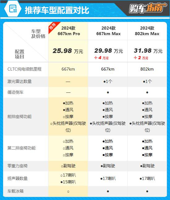 通过对比设备不难看出,推荐车型和高级车型。 667km Max 与版本相比,只缺少激光雷达、倒车跟踪、前排座椅按摩。 / 头枕音箱,第二排座椅加热 / 通风 / 如果后排不经常坐人,按摩、车载冰箱等锦上添花功能,即使没有这些高级配置,对日常生活中的汽车也不会有太大影响。考虑到大多数舒适配置支持选择,以及两者之间的选择, 4 一万元的差价,显然推荐性价比更高的车型。