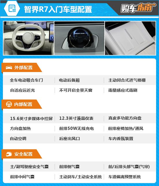 2024 款智界 R7 入门级车型配备性能十分出色,不但具有全面的基本功能,而且在主要位置。 / 被动安全、智能配置和辅助驾驶系统也非常友好,提供了自动变道辅助、匝道自动离开(进入)等。、高级功能,如信号灯识别。再加上入门级车型相对较低的价格,当选本次推荐车型名正言顺。
