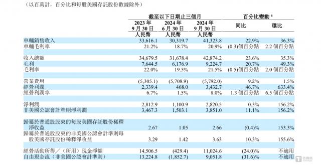 从板块来看,理想汽车的销售收入是 413 亿元,较 2023 年度第三季度 336 亿元增强了 22.9%;其它销售和服务收入为 16 亿元,较 2023 年同期的 11 亿元增加 45.8%。