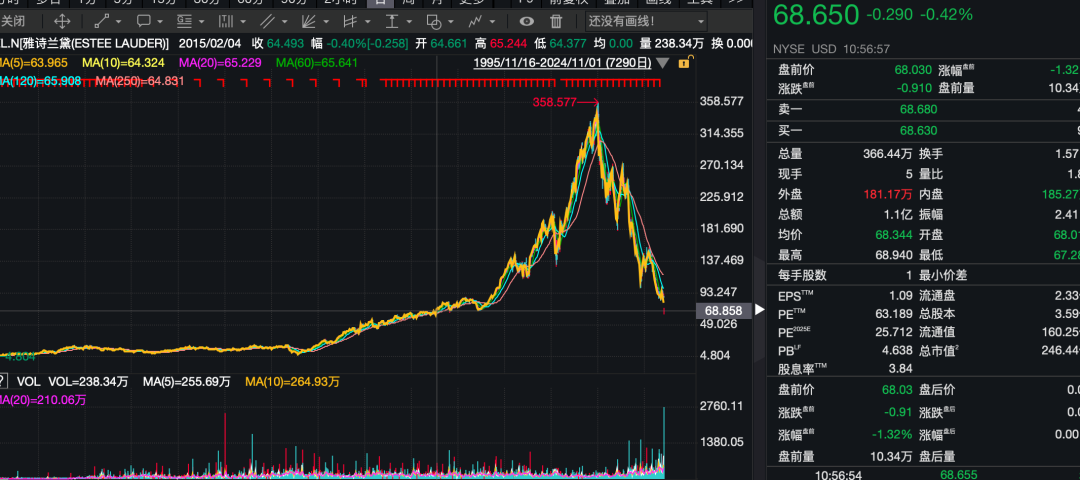 值得注意的是,面对复杂的环境和挑战,在最新的财务报告中,雅诗兰黛撤回了2025财年的展望,降低了分红,十月三十一日,雅诗兰黛股价一度下跌超过27%,随后下跌至20%。,在2022年初,每股358美元的峰值下跌了80%,几乎回到了十年前的股价水平。十一月一日,雅诗兰黛股价持续下跌,截至发稿时,股价已达68.65美元。
