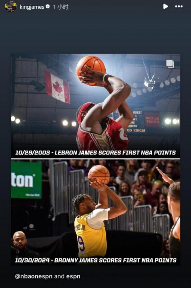 詹姆斯在 INS 上面晒出布朗尼 NBA 职业生涯的第一分,也比较了自己职业生涯的第一分。相同的分数方法,只是日期差一天。