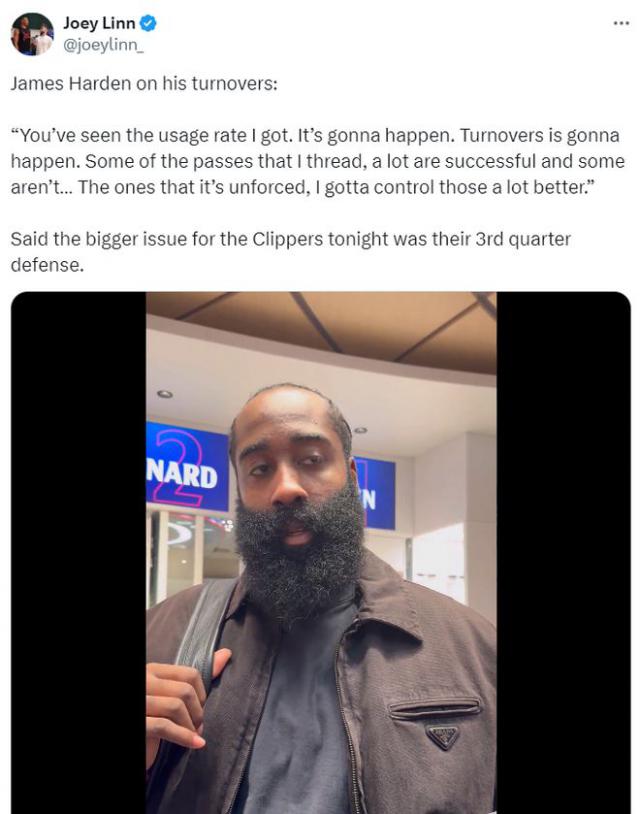 在采访中,哈登回应自己效率低下。 错误率高的问题:你应该看到我的利用率。错误必然会发生。我想传很多球,有些是成功的,有些不是,有些不是被迫的。我需要更好地控制球。