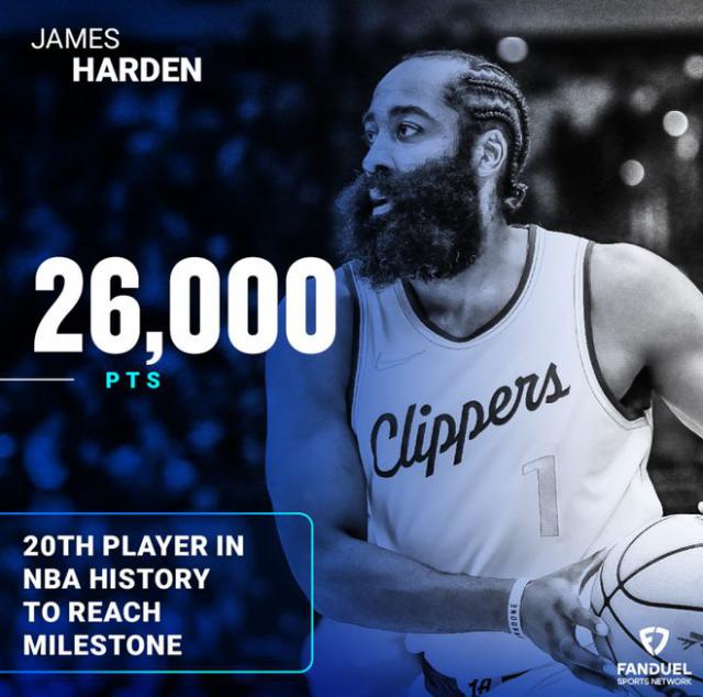 2、NBA 职业生涯总得分突破 26000 价位(26004 分);