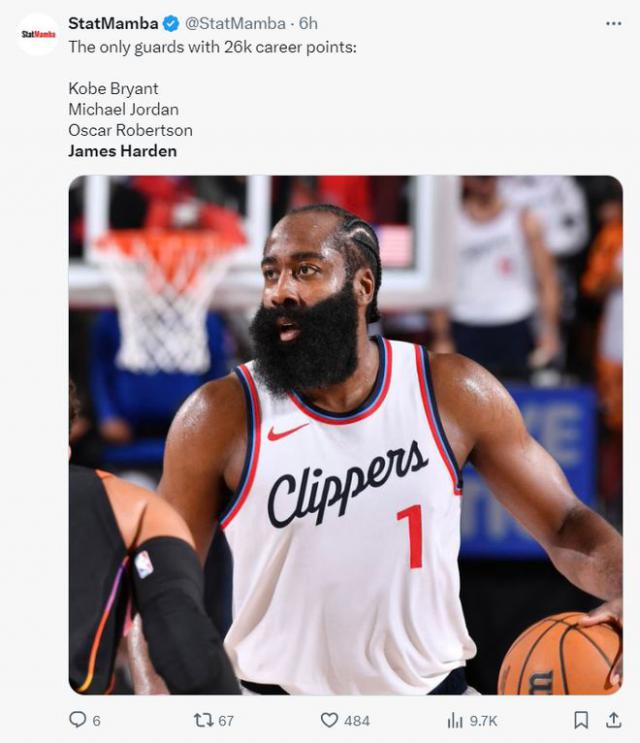 6、哈登是 NBA 后卫身份在历史上排名第四。 26000 分选手;