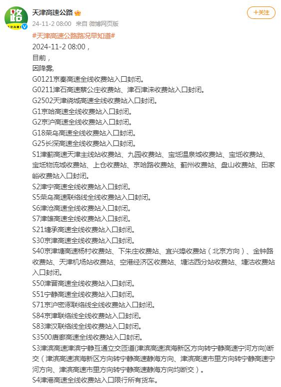 天津多条高速公路收费站入口封闭