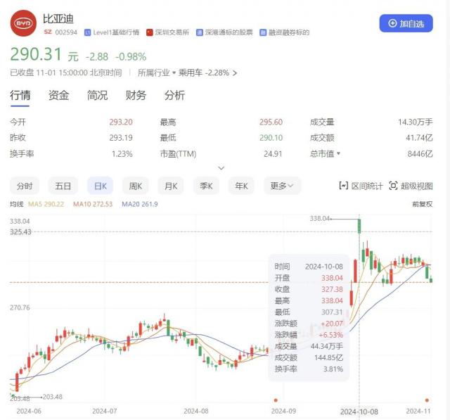 令人惊讶的是,比亚迪的股价在财务报告发布的第二天就跌破了。 300 人民币价格,截至周五收盘股价为 290.31 元,几乎回到了一个月前,而在过去的一个月里,比亚迪的股价一路飙升至一路飙升。 338.04 人民币,市值一度接近万亿元大关,现在又跌破了 300 元,真是令人叹为观止。