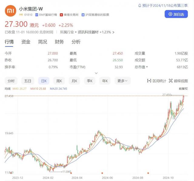 除强烈的市场反应外,在股票市场上,投资者也用真金白银表达了态度, 10 月 30 日起小米集团股价迎来三连涨,截止收盘股价为: 27.30 港币,单周涨幅超过 5%,而且从更长的时间来看,自小米汽车出现以来,小米的股价一直在持续上涨,从年初开始。 15 现在港币已经涨到了现在 27 港币。