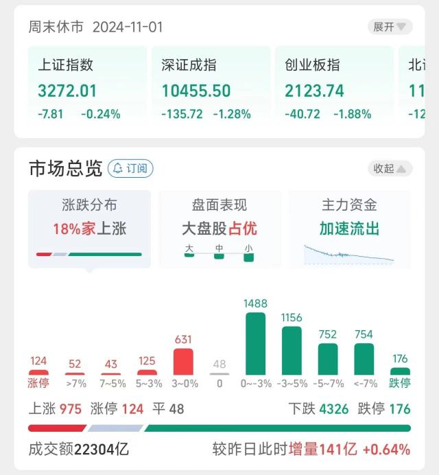 截至周五收盘,上证指数微跌。 0.24%,报 3272.01 点,深成指下跌 1.28%,报 10455.50 点,创业板下跌 1.88%,报 2133.74 点,两市全天成交额超过全天成交额。 22000 亿元,与前日持平,市场超过了前一天。 4100 股价下跌,159 股价下跌。