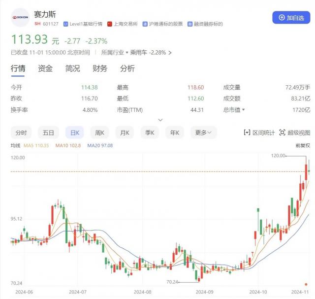 本周,赛力斯的股价迎来了四连跳,从开盘开始。 102.47 元一路高歌猛进 120 每股人民币,最后一周收盘。 113.93 元,再次绕过 100 元价位。