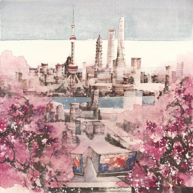 在过去的一两年里,汪家芳的城市主题创作更多的是一系列规模适中的作品,从更亲密的角度打开了城市丰富多彩的取景框。他用画笔勾勒出“四叶草”国家会展中心的英雄气概,“鹦鹉螺”上海光源科学中心的氛围,自贸区“海鸥门”的开放,洋山深水港众多塔吊的忙碌,也捕捉到了梧桐树下小路的宁静,石库门里的烟火,锦江乐园摩天轮的温暖,郊区桃花盛开的活力。这一年,他还终于画了一条苏州河,自家楼下的苏州河。画面中,半马苏河邮轮码头上的船只,漾起了苏州河畔越来越美丽的风景,也漾起了人们对美好生活的向往。在艺术表现手法上,这些作品展现了一些可喜的新尝试:以更加自由灵动的水墨,创造更加优雅的精神空间。