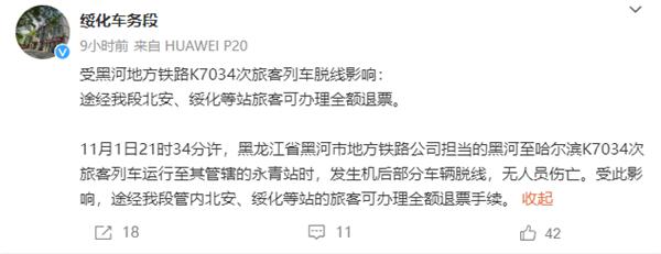 受到黑河地方铁路的影响 K7034 次旅客列车脱线影响:经我段北安、绥化等站旅客可办理全额退票。