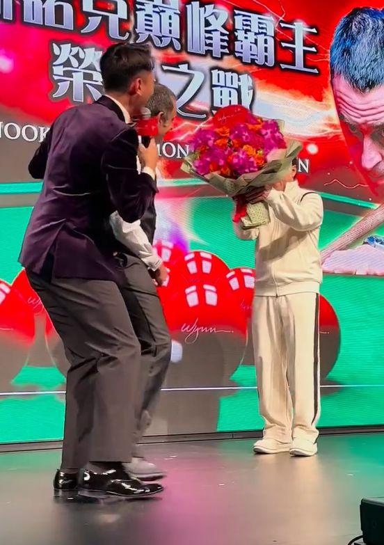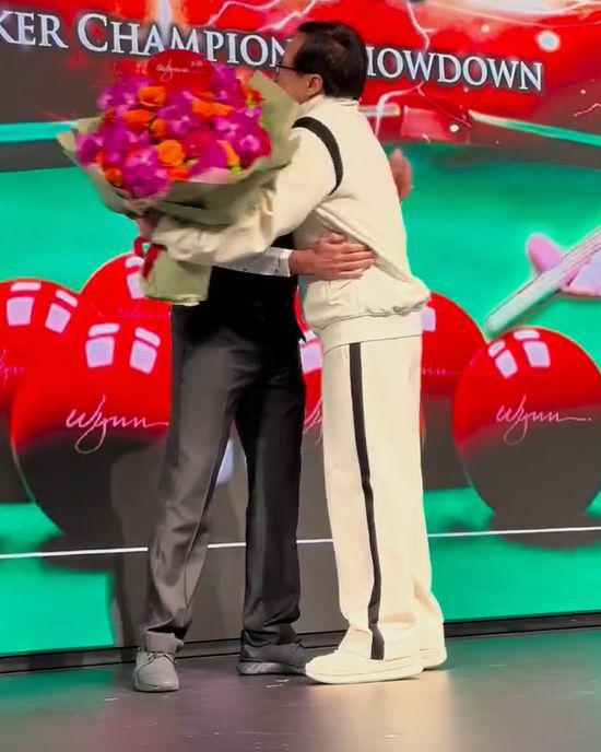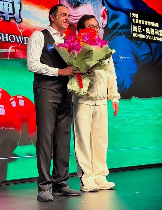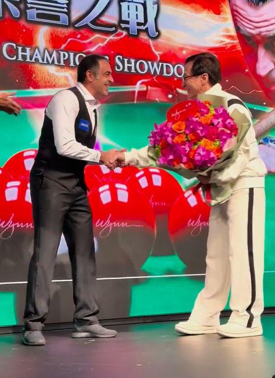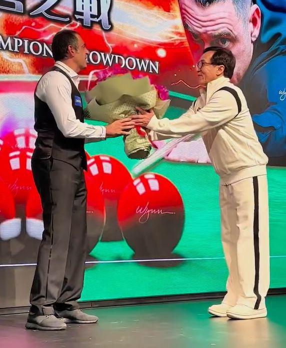 成龙惊喜出现在澳门,为奥沙利文献花祝贺,罗尼成功追星非常高兴。