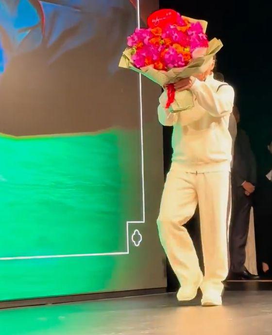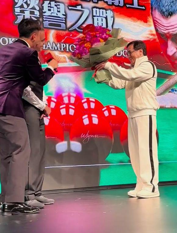 成龙穿着白色运动服和白色运动鞋走上舞台。然而,他没有直接出现,而是拿着一束花放在他面前,花束完全遮住了他的脸。舞台上的人不知道他是谁。然而,观众可以清楚地看到,他们也因为成龙的到来而感到非常高兴,他们在舞台下欢呼。