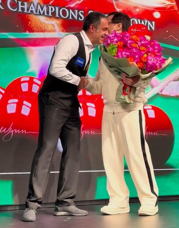 罗尼站在舞台上 · 奥沙利文奇怪地看着被挡住脸的成龙跟着他。主持人让他猜想是谁,但他分不清是谁。他只能奇怪地探头看着花束后的人,最后被成龙避开了。之后,成龙终于露面了,这让罗尼 · 奥沙利文非常高兴,兴奋地伸手向成龙握手,拥抱。