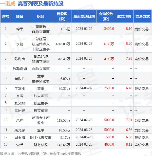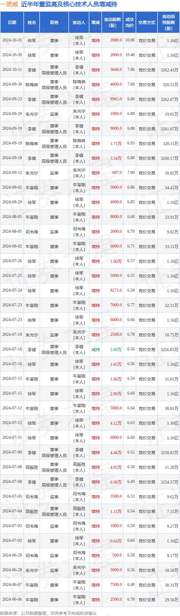 近半年来,一诺威董监高和核心技术人员的调整持有以下详细信息: