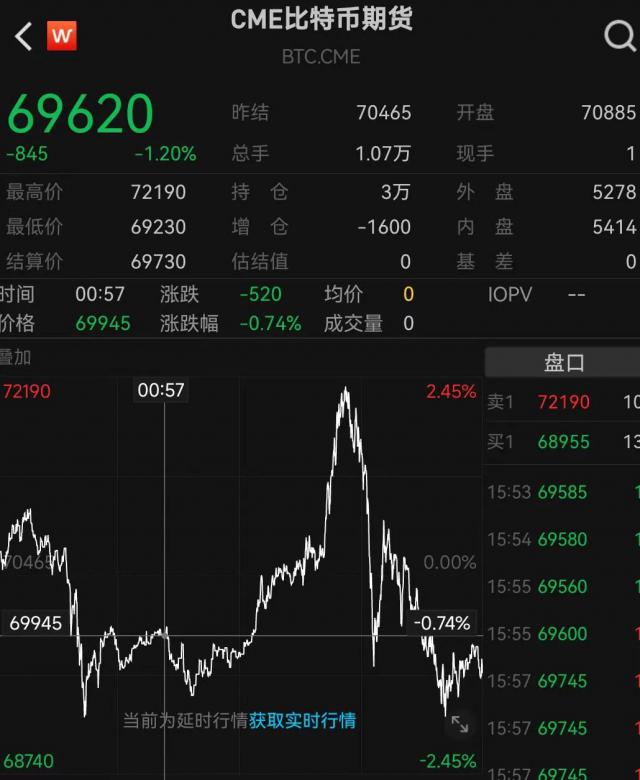 在纽约收盘之前,CME 比特币期货 BTC 主力合约报 69620.00 与周四相比,美元在纽约尾盘下跌 北京时间1.20% 22:30(美国非农就业报告公布后)刷新了日高,这周累涨 1.36%,10 月 29 日曾刷新期内高位至 74485.00 美金。