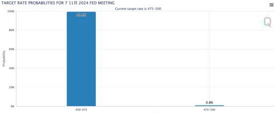 芝商所 FedWatch 工具显示,美国劳工部发布的数据 45 几分钟后,美联储 11 月降息 25 一个基点的概率上升到 前一天的概率是99.2%, 94.8%。