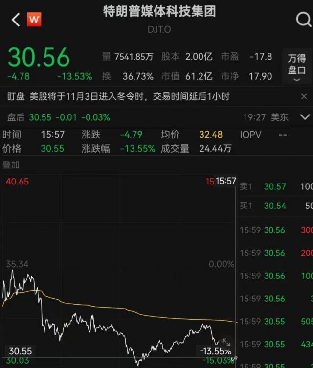 截至美股最新收盘,特朗普媒体科技集团报道 30.56 美元,跌幅超过 13%。