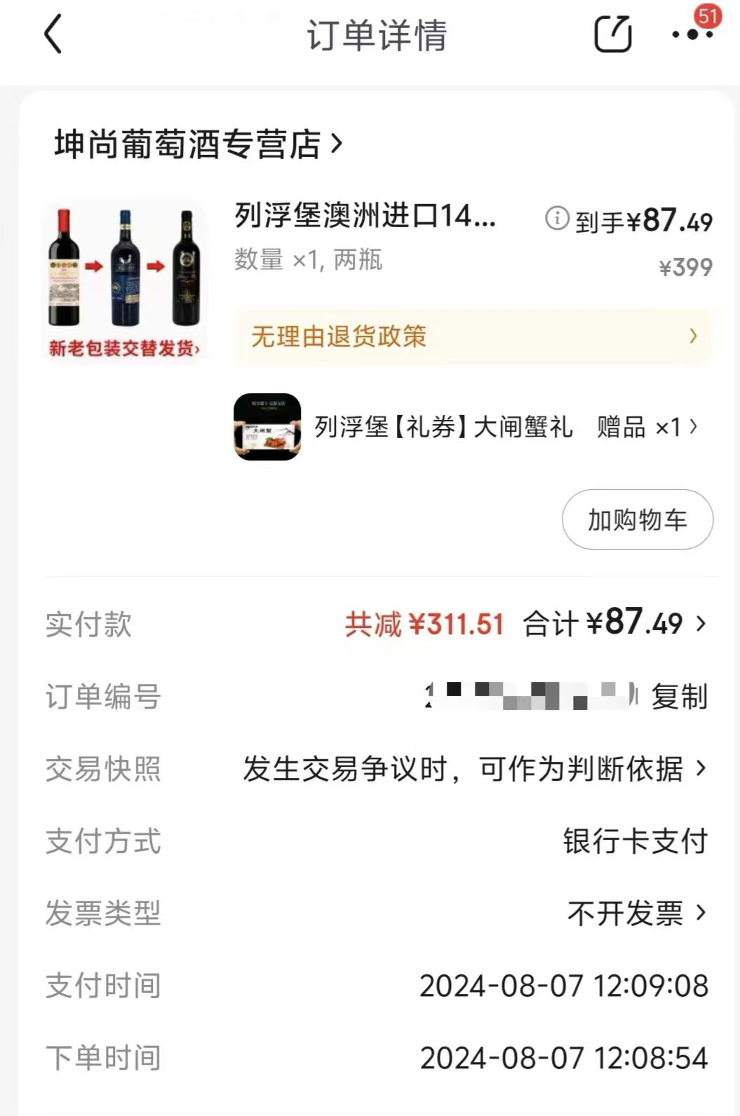 据张先生介绍,8月7日,他在坤尚葡萄酒线上加盟店看中了一款红酒产品。详情页显示,87.49元可以买两瓶进口红酒,并获得两张大闸蟹礼券。“我一看到大闸蟹是四公四母,挺合适的,就买了。”