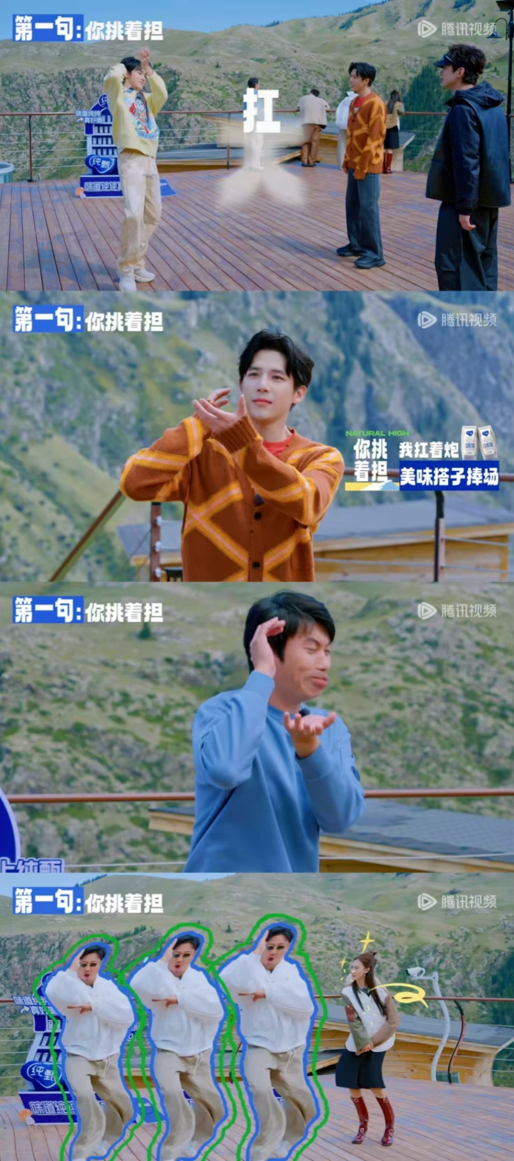 本期第一个搞笑的声音来源于出发前的荒野默契测试——在你比划我猜到的“歌词传声筒”游戏中,很明显,跨代差的嘉宾对歌词内容有自己的解读。“期待违反”的是,最大的bug并没有卡在沈腾和贾冰身上,而是在猜测《敢问路在哪里》的时候,第二棒的宋亚轩根本不懂白敬亭比画的歌词,所以他错过了所有人。每个人都把“你挑担子”演绎成“你背着炮”。