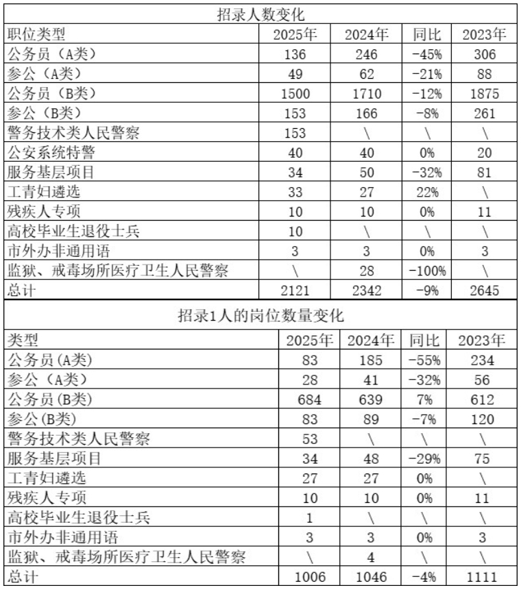 就招聘人数而言,2025年公务员A类和B类招聘人数均有所下降。