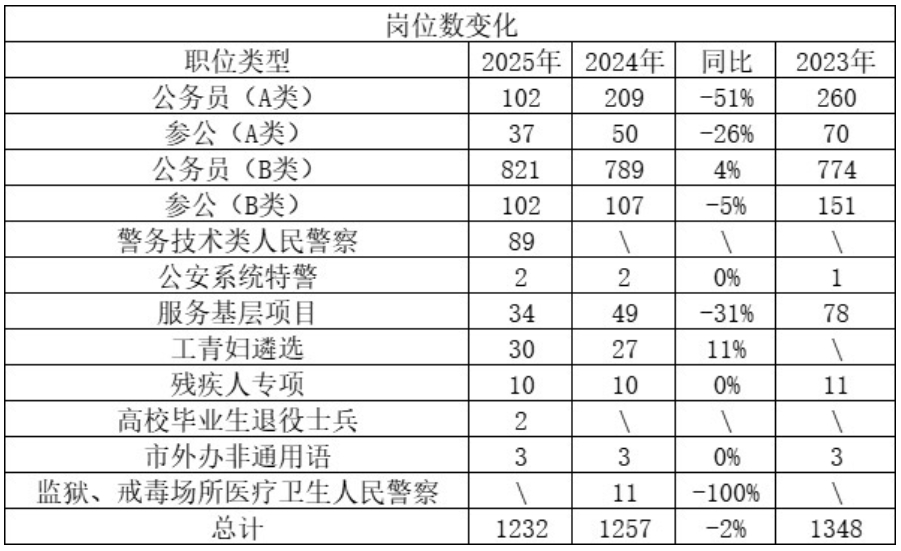 2025年新增两类岗位,分别是警务技术人民警察岗位和大学毕业生退役士兵重点岗位。