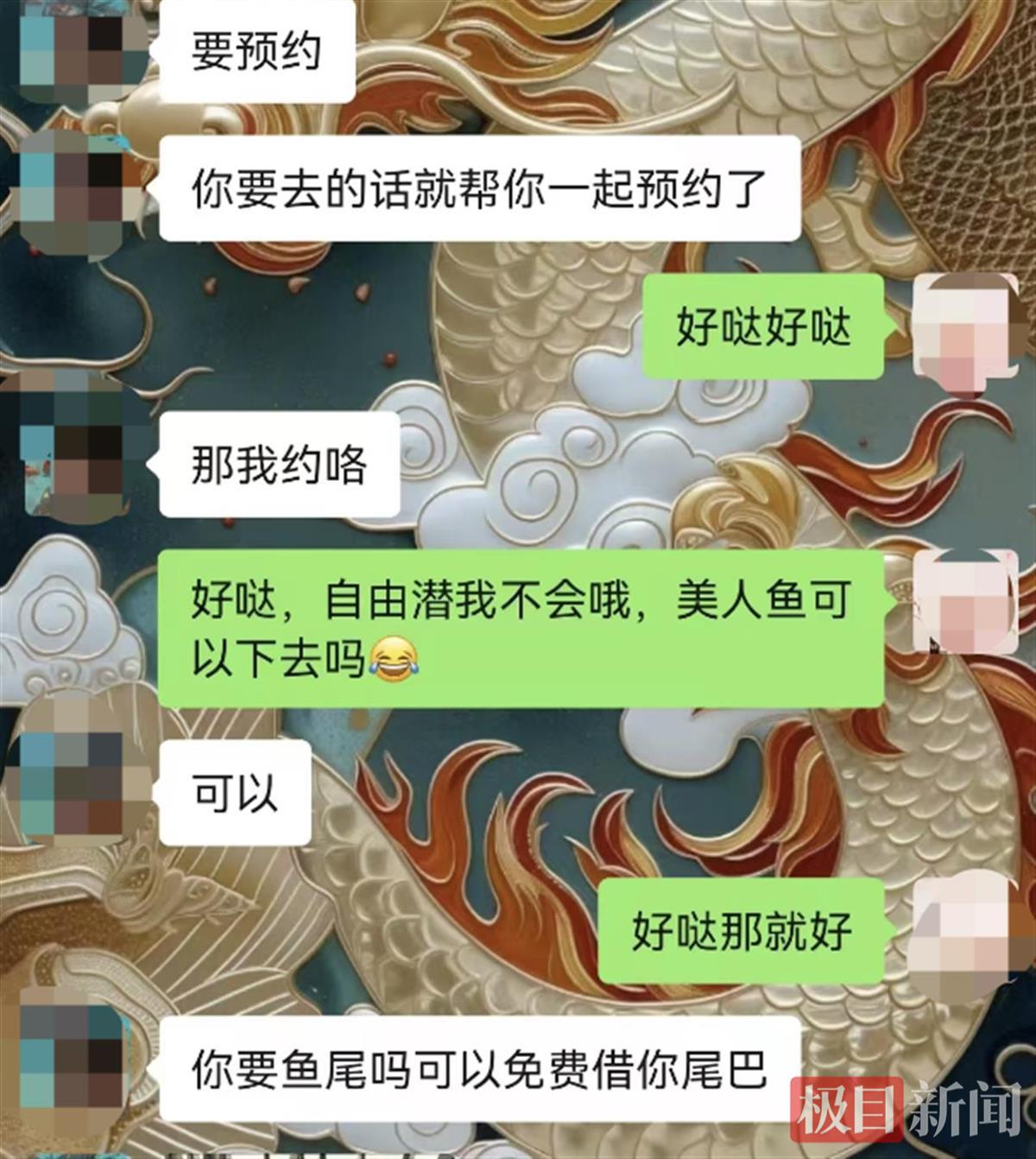聊天记录显示,该网友表示,白龙洞门票150元,潜水也需预约。水肺排水 (在岸边)吃饭120元,水肺排水但不吃100元;自由潜水 吃饭 排水带灯150元,自由潜水排水但不吃130元。小霞问:“我不能自由潜水。美人鱼能下去吗?”对方说,是的,并帮助小霞成功预约。
