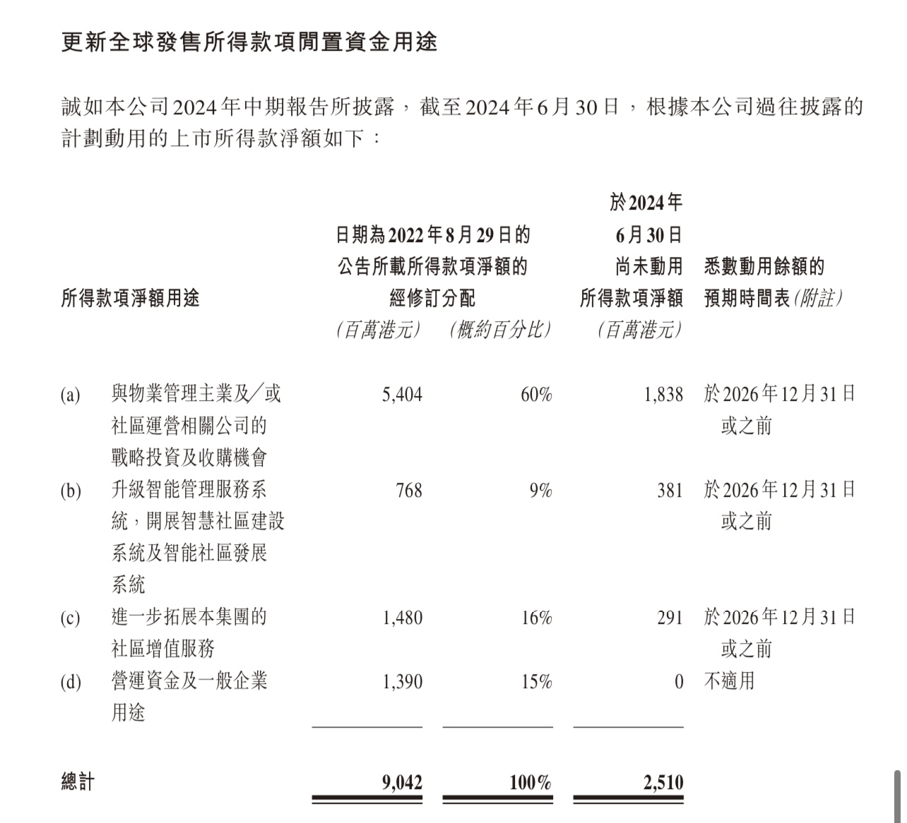 截至2024年6月30日,根据融创服务此前公布的计划,上市所得净额如下: