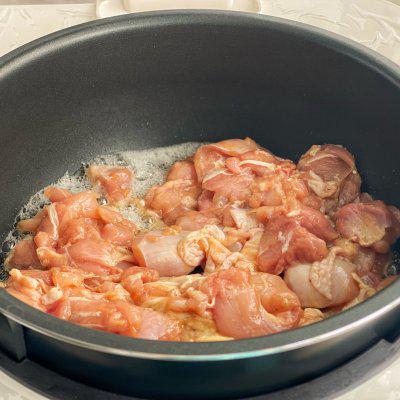 2、锅内倒油加热后,倒入腌制好的鸡腿肉翻炒至变色。