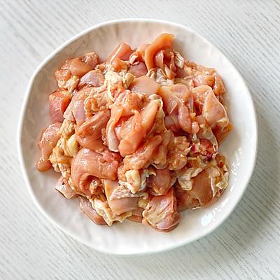 1、鸡腿肉去骨切成块,加入酱油、耗油、黄酒、盐、白胡椒粉,均匀腌制。 15 分钟