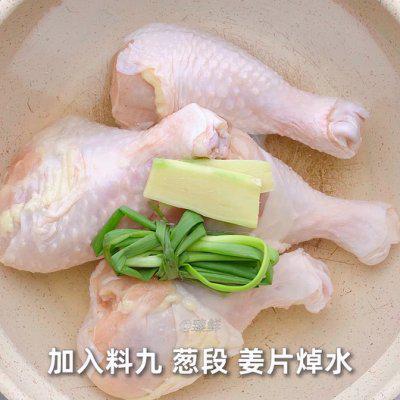 1、将鸡腿放入冷水中,加入米酒、葱段、姜片焯水;煮熟后捞出冷水,撕成小块,放入盆中