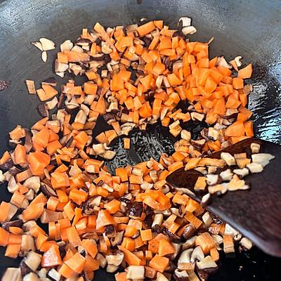 6、蘑菇泡发,切丁,滚入锅中翻炒出香味。