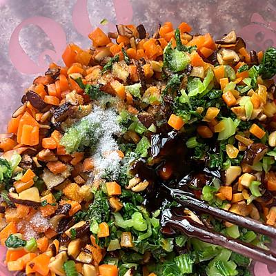 1. 当你醒来时,你可以开始做馅料。馅料做好了,面条也差不多发好了。 2. 加入猪油的面粉会更白,加入白糖可以加速醒面的时间。 3. 胡萝卜,香菇炒过,更香。