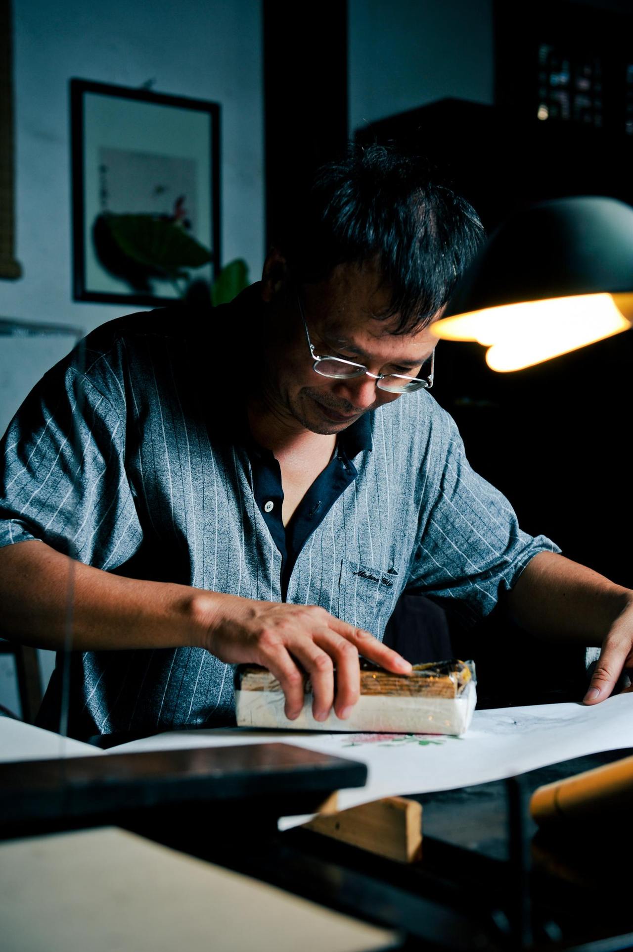 这是国家级非物质文化遗产代表性传承人黄小建杭州雕版印刷技术的工作室。和孩子黄捷成相连,这里有四个同事。