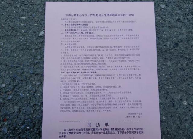 胜利小学也做了相应的调整,印制了《致家长信》,重点关注学校(秋季)的作息事件,提醒家长“一定不要早到学校,避免在外面追逐、打闹、停留等情况。”“一年级和二年级的学生必须由家长接送”。信下附有收据,要求家长签字。