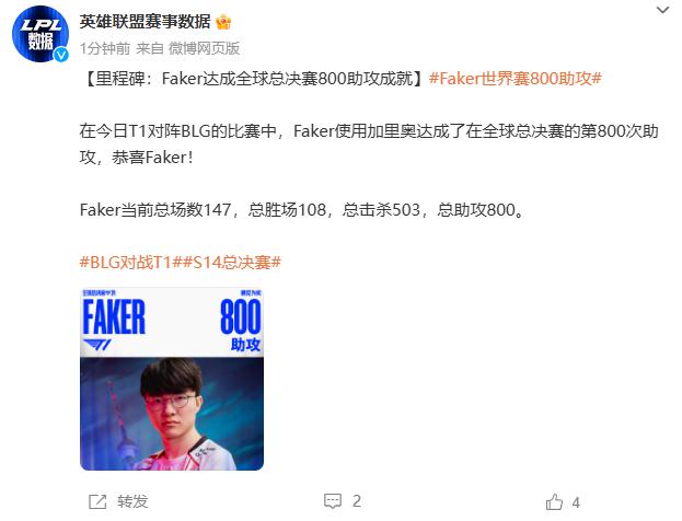 在获得冠军的同时,Faker 进入世界总决赛 800 助攻和助攻成就 500 杀戮成就,前所未有。
