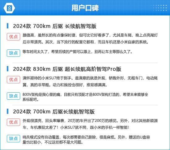 大多数顾客对小米的口碑, SU7 外观设计和技术特点令人满意,但也有消费者反映候车时间过长,哨兵模式没有自动覆盖,现在只有顶配才是基于。 800V 架构打造。