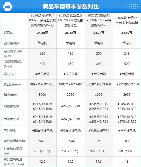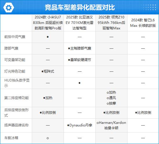伴随着新能源汽车的蓬勃发展,越来越多的汽车企业开始丰富自己的产品线。尤其是在纯电动中大型汽车领域,这次我们选择了市场上最受欢迎的三款车,分别是比亚迪汉和领克。 Z10 以及智己 L6。通过配置对比不难看出,四款车的基本配置都非常完善,只在高级配置上有所不同。其中,小米 SU7 独占前排中间气囊,矩阵大灯,并标配第二排座椅加热,支持车载冰箱功能选择,使用体验极佳。小米更为重要 SU7 的 CLTC 纯电续航里程是四款车中最高的,在一定程度上可以缓解客户的续航焦虑。