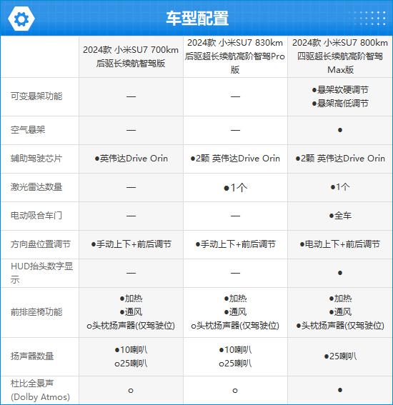 通过配置对比发现,小米 SU7 提供两种动力和多种电池寿命,可以满足不同客户的需求。同时,整个系统的标准功能非常丰富,只在高级配置上有所不同。例如,高端车型提供硬件和硬件 / 高度可调的空气悬架,多种选择设备成为标准。此外,辅助驾驶芯片和激光雷达的数量也不同。总的来说,小米 SU7 装备性能较好。