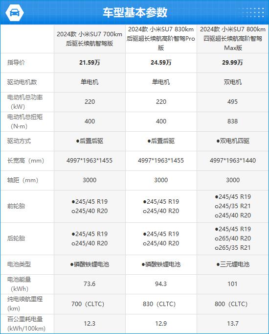 动力方面,小米 SU7 提供两种动力版本:单电机和双电机,电机总功率分别为 220kW 和 总扭距分别为495kW。 400N · m 和 838N · m。CLTC 纯电续航里程各自可达到 700km、830km、800km。