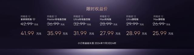 11 月 2 日,阿维塔 12 双动力正式上市,提供纯电、增程版(新增)两个版本共六辆车,官方价格 26.99 一万元起;限时销售 25.99 万元起。