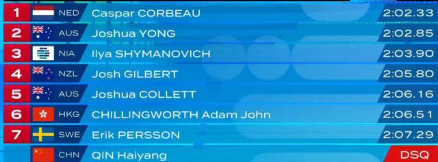 尽管领先到边完成了比赛,但是由于犯规而取消了他的成绩。考比乌 2 分 02 秒 33 拿到金牌,约书亚 - 杨 2 分 02 秒 85 获得银牌,希马诺维奇 2 分 03 秒 90 获得铜牌。